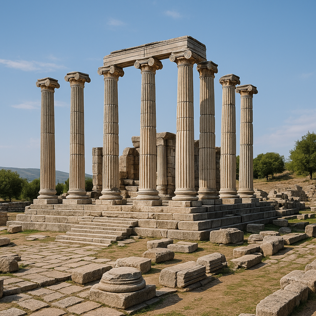 The temple dates to the late 2nd century BC and was constructed in the Ionic order. Its design is attributed to the architect Hermogenes of Priene, who introduced the pseudodipteral plan—a layout that gives the appearance of a double colonnade but leaves extra space around the cella. The temple measures roughly 8.5 × 40 meters, surrounded by 36 columns with an octastyle façade (8 columns across the front).